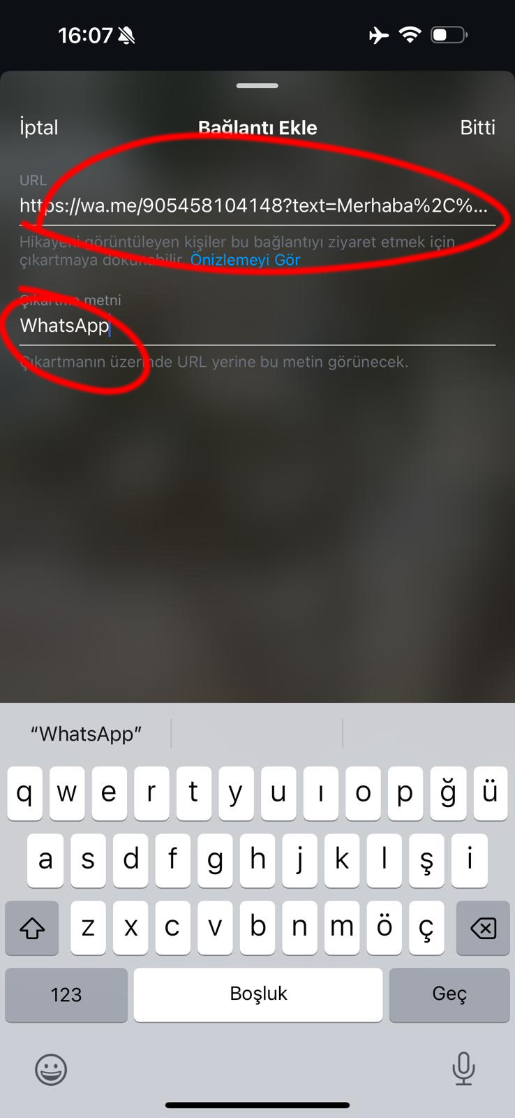 5. Oluşturduğunuz WhatsApp linkini buraya yapıştırın ve bir çıkartma metni ekleyin.