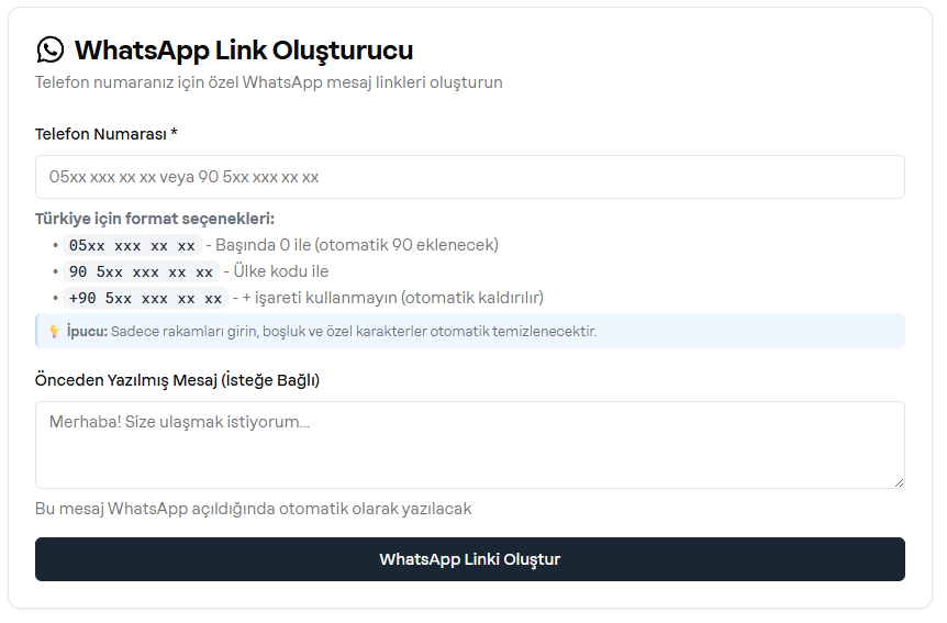 Takipçilerinizin tıkladığında doğrudan size WhatsApp üzerinden mesaj atabileceği bir link oluşturmak için whatsapp link oluşturucu aracından faydalanabilirsiniz. Bu araç ile numaranızı ve mesajınızı girdikten sonra paylaşmaya hazır bir link elde edebilirsiniz.